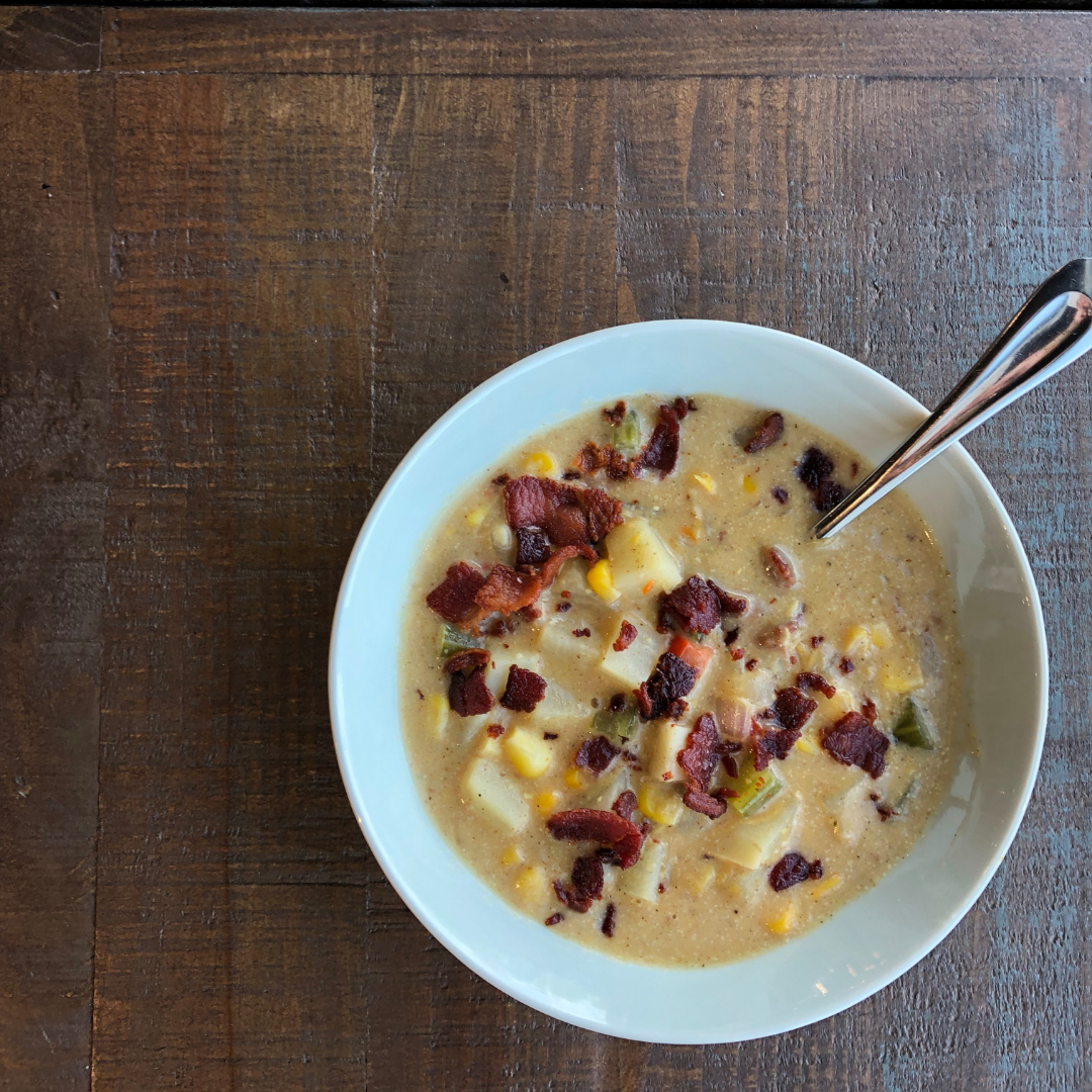 Uncover the pot and add the potato, half-and-half, and corn. Simmer, uncovered, until the potato is very tender but not yet falling apart, 10 to 12 minutes. If desired, puree about a cup of the soup in a food processor or blender and stir it back into the soup. Discard the bay leaves. Serve garnished with the cooked bacon and some chives or parsley.