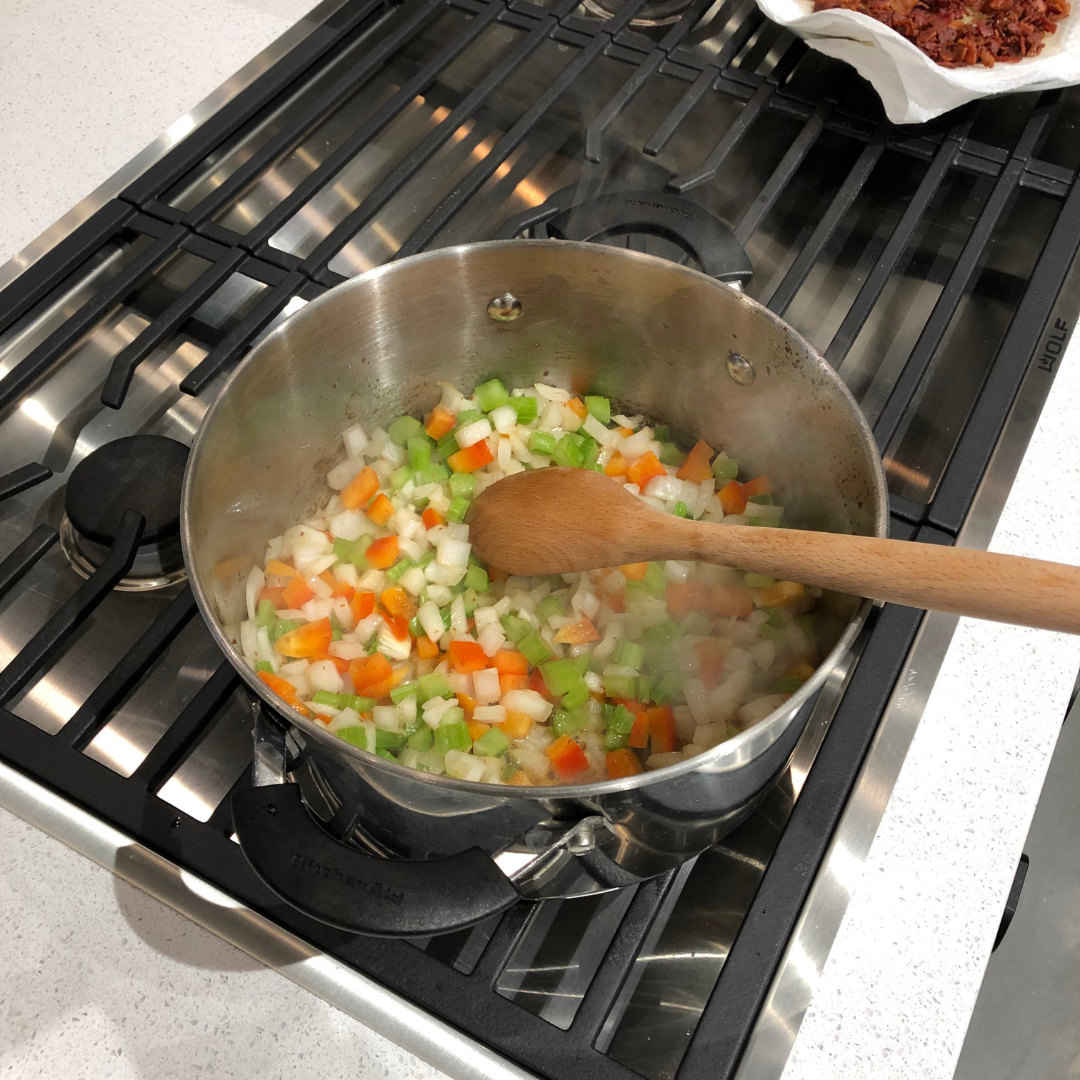 Drain or spoon off all but 3 tablespoons of the bacon fat in the pot. Add the onion, bell pepper, and celery and cook, stirring occasionally, until the vegetables just begin to become tender, about 5 minutes. Season with salt and pepper and add the flour, thyme, paprika, and bay leaves. Stir the flour into the vegetables to make a paste and coat them evenly. Cook a minute or two to get rid of the raw flour smell. Add the chicken broth and bring to a simmer. Cover and simmer until all of the vegetables are tender, about 15 minutes.