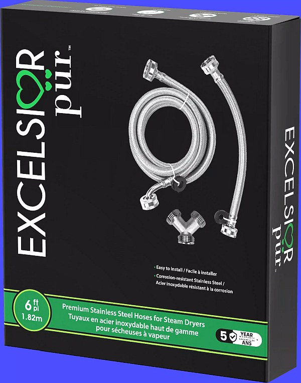 Designed for modern steam-enabled laundry appliances, the Excelsior Pür Steam Kit Hoses deliver reliability and effortless installation. Crafted from 304XS braided stainless-steel with precision knurling and enhanced connector teeth, these hoses ensure a secure fit without tools. Featuring a powerful 2500 PSI burst rating and a larger internal diameter to minimize water knocking, this 6 ft hose kit offers premium durability.Read More