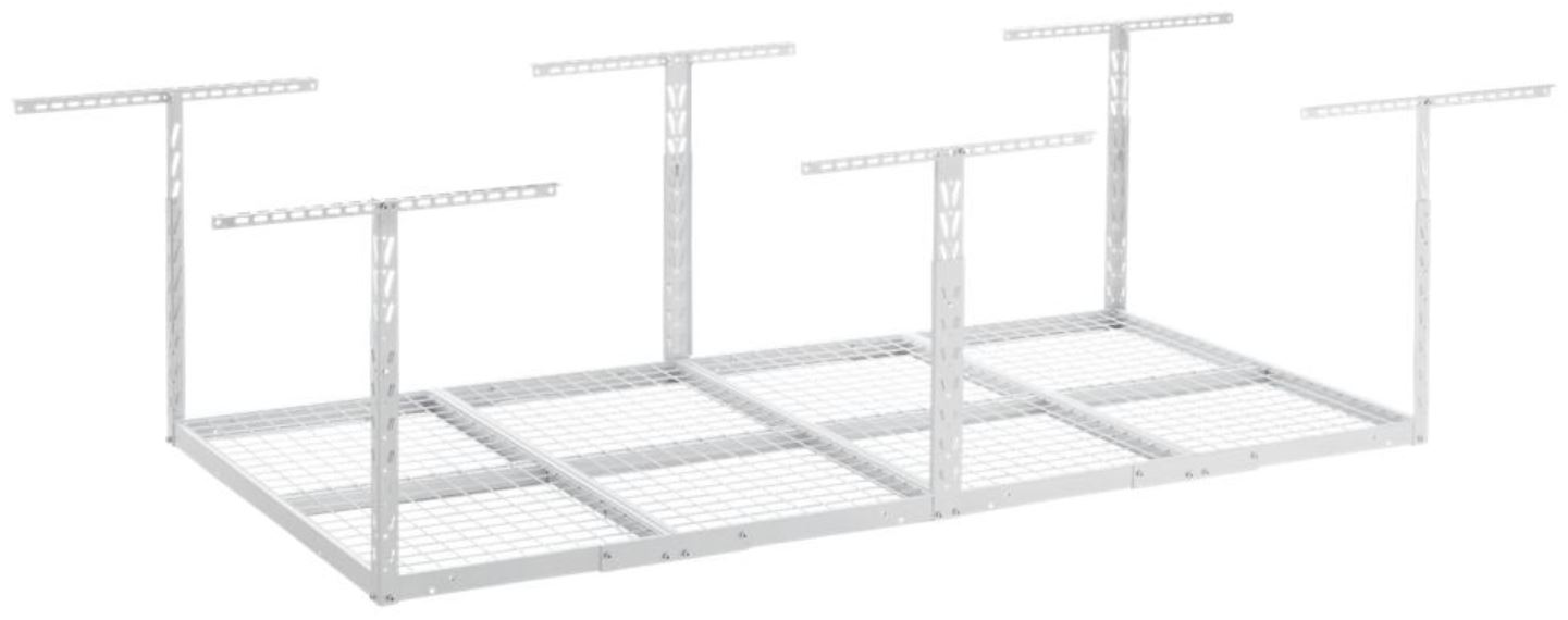 Gladiator® Overhead GearLoft™ Storage adds a new dimension to garage organization. Get a range of items off the floor, from seasonal items and building supplies to full-sized bins and totes. The adjustable height allows for up to 96 cu. ft. of storage, and the rack holds up to 750 lbs (340.2 kg) of evenly distributed weight.Read More