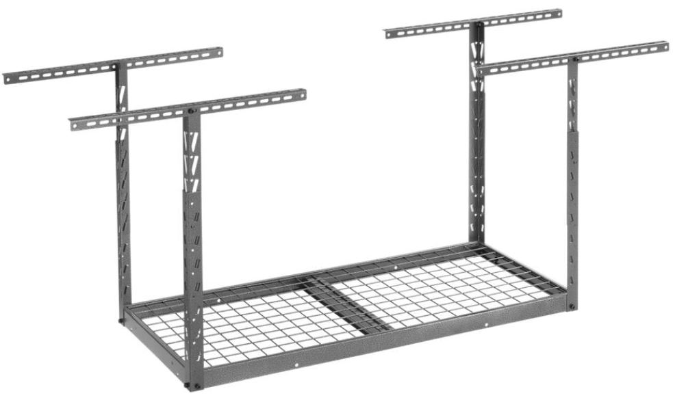 Gladiator® Overhead GearLoft™ Storage Rack adds a new dimension to garage organization. Get a range of items off the floor, from seasonal items and building supplies to full-sized bins and totes. The adjustable height allows for up to 25 cu. ft. of storage, and the rack holds up to 350 lbs (158.9 kg) of evenly distributed weight.Read More
