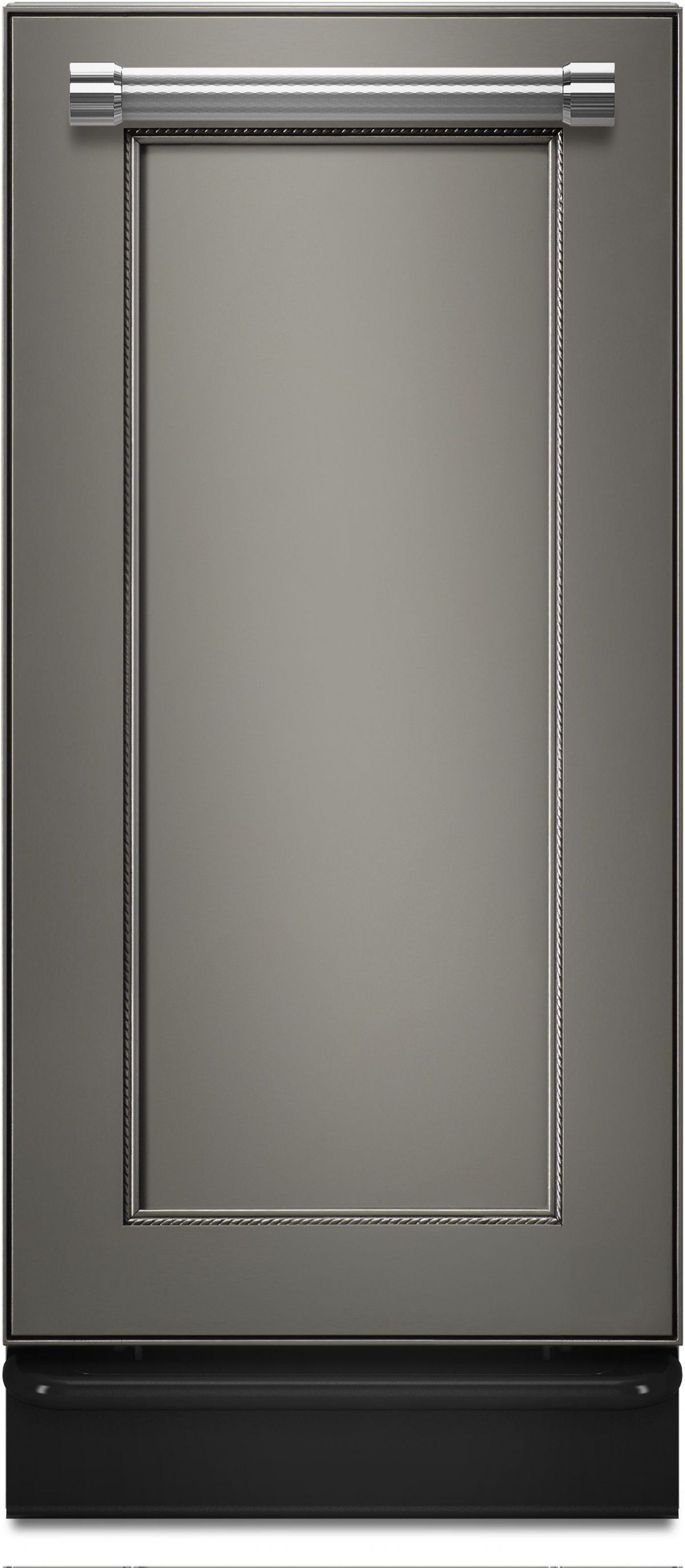 Allows you to install a custom front panel and handle (not included) over the trash compactor door to create a seamless look with kitchen cabinetry.