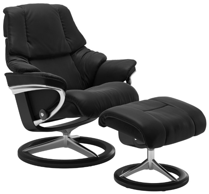 The Stressless® Reno Manual Recliner and Ottoman with Signature Base provides ergonomic comfort with smooth manual adjustments. The high back and cushioned seat offer excellent support, while the Signature Base adds flexibility and gentle motion. Customizable upholstery ensures it complements any space, making it both stylish and comfortable.Read More