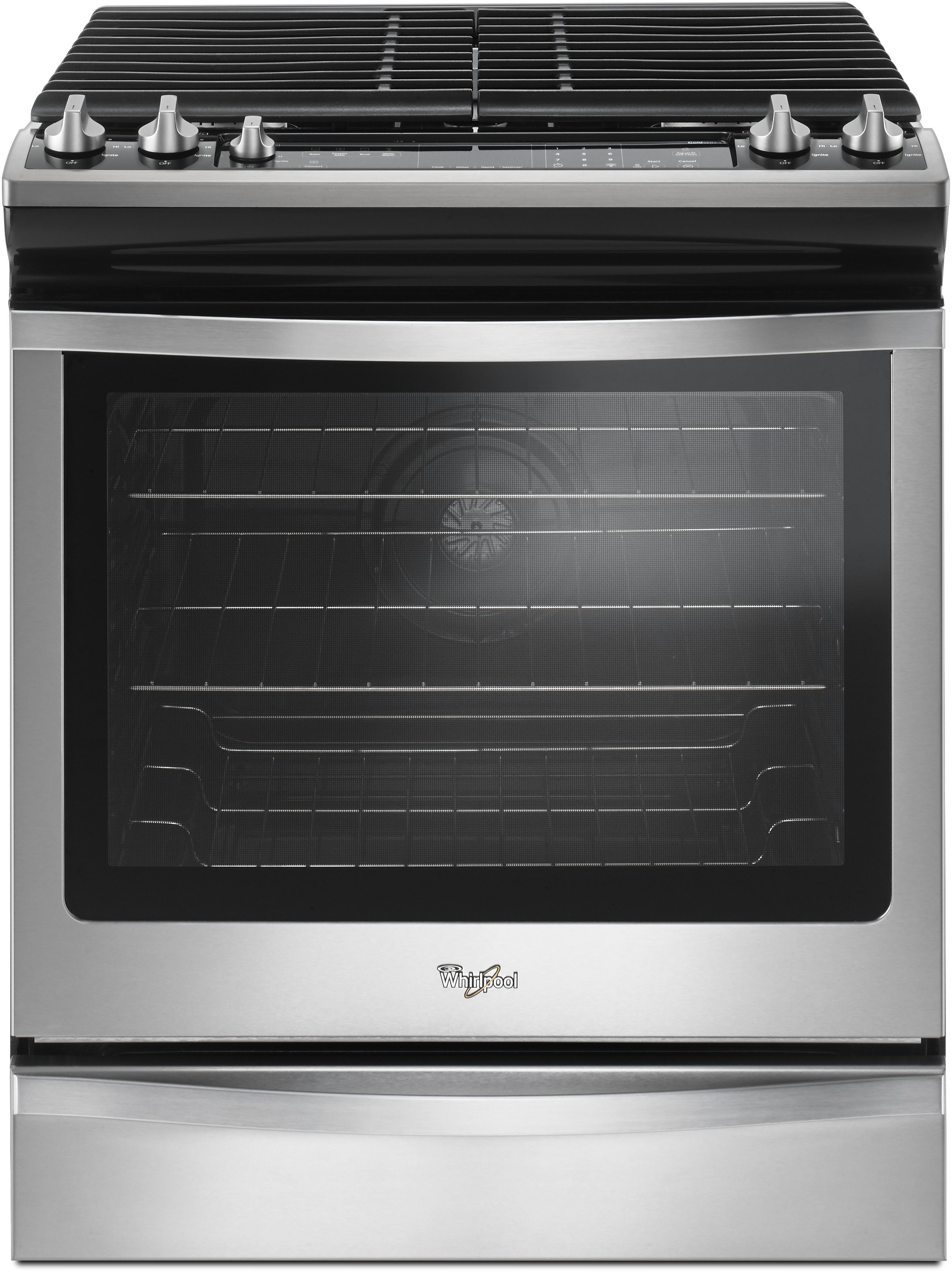 Take on family favourites with this front control gas range designed to fit your kitchen and your cooking. Frozen Bake™ technology lets you skip preheating the oven range for frozen dishes like pizza, lasagna, chicken nuggets, fries or pies. Cook food faster with this kitchen range's true convection cooking. Convection Conversion will do the math for you to adjust cooking times and temperatures. Large griddles and other longer cookware heat evenly on the range stove with the center oval burner. And when it's time to clean up, EZ-2-Lift™ hinged cast-iron grates provide quick access to wipe up spills on the kitchen range's cooktop.Read More